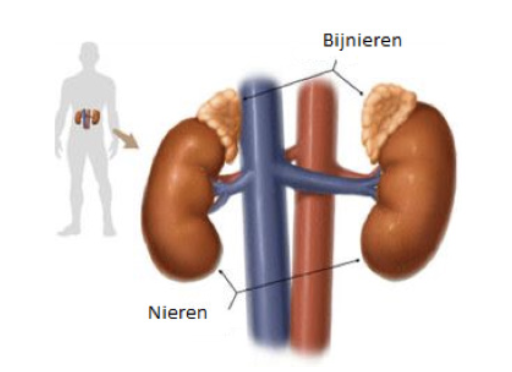 De hypothalamus en hypofyse zijn onderdelen van de hersenen. De bijnier is een orgaan gelegen in de buik net boven de nier.