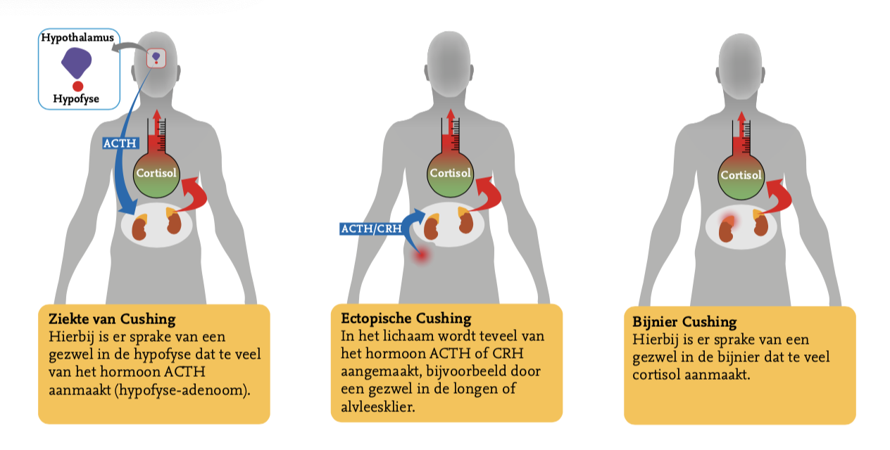 - Ziekte van Cushing: hierbij is er een gezwel in de hypofyse (= hypofyse-adenoom) dat zorgt voor een te hoge productie van ACTH.